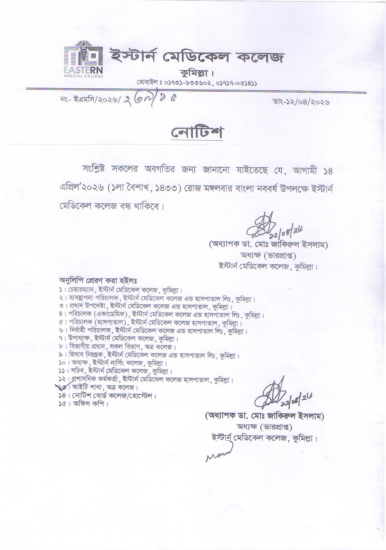 আগামী ১৪ এপ্রিল ২০২৬ (১লা বৈশাখ, ১৪৩৩) রোজ মঙ্গলবার বাংলা নববর্ষ উপলক্ষ্যে ইস্টার্ন মেডিকেল কলেজ বন্ধের নোটিশ_ইএমসি/২০২৬/২৩৯/১৫ | ![]() |
