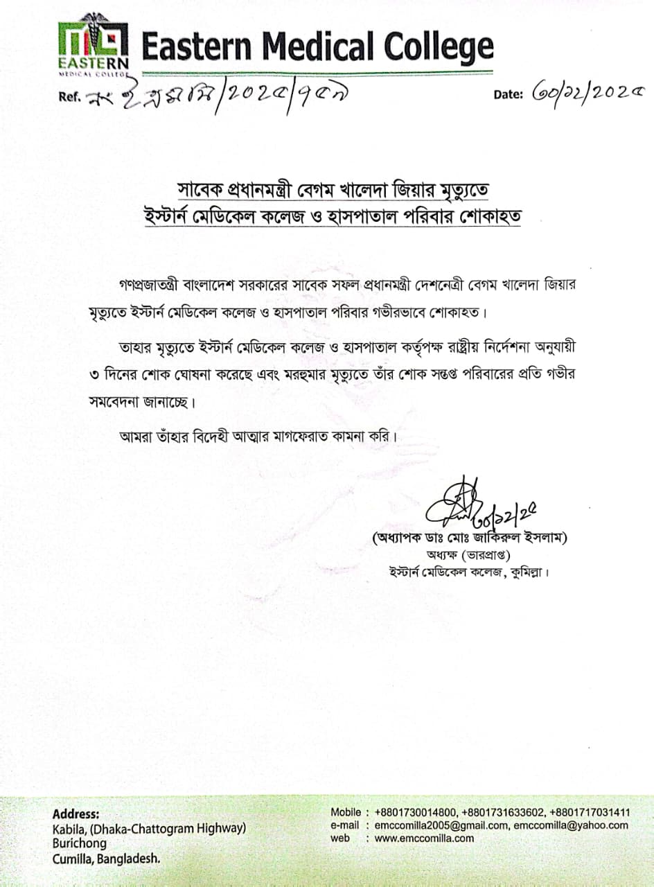 গণপ্রজাতন্ত্রী বাংলাদেশ সরকারের সাবেক সফল প্রধানমন্রী দেশনেত্রী বেগম খালেদা জিয়ার মৃত্যতে ইস্টার্ন মেডিকেল কলেজ ও হাসপাতাল পরিবার গভীরভাবে শোকাহত | ![]() |