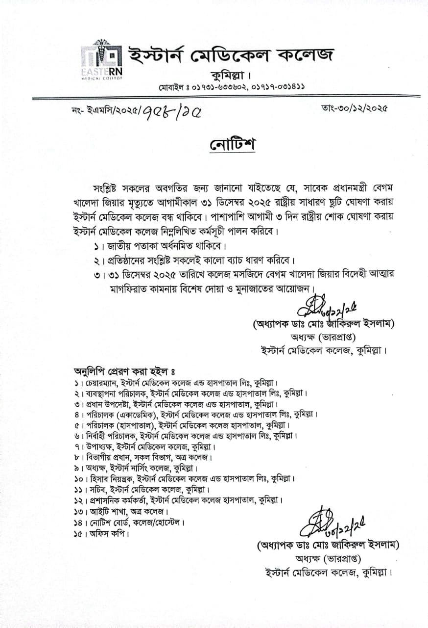 গণপ্রজাতন্ত্রী বাংলাদেশ সরকারের সাবেক সফল প্রধানমন্রী দেশনেত্রী বেগম খালেদা জিয়ার মৃত্যতে আগামীকাল ৩১ ডিসেম্বর ২০২৫ রাষ্ট্রীয় সাধারণ ছুটি ঘোষণা করায় ইস্টার্ন মেডিকেল বন্ধ থাকার নোটিশ | ![]() |